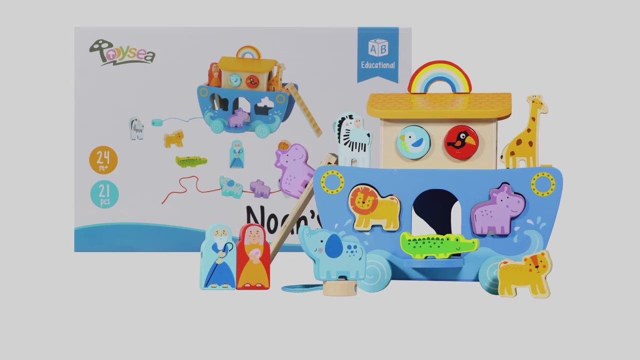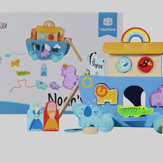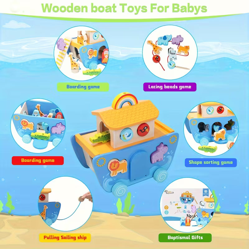 El Barco Educativo Arca de Animales es un set de madera lleno de actividades que estimulan el desarrollo motor, la coordinación mano-ojo y la creatividad de los pequeños mientras juegan con animales, colores y formas.