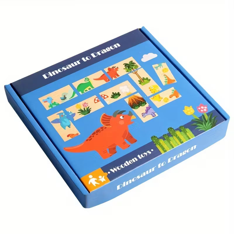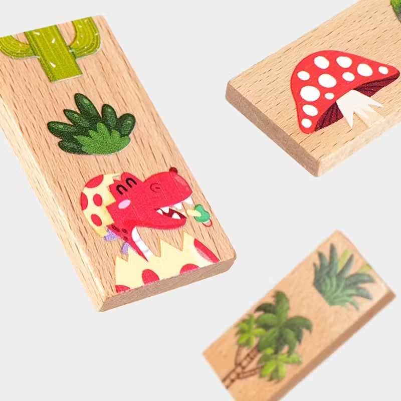 El Dominó de Dinosaurios de Madera reta a los pequeños a unir piezas ilustradas para formar escenas continuas, fortaleciendo el pensamiento lógico, la observación y la concentración.