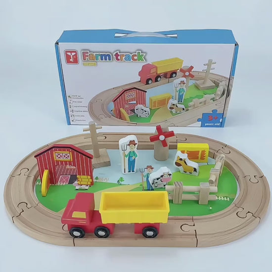 Granja sobre Rieles es un juego de vías de tren de madera diseñado para que niñas y niños creen su propio recorrido dentro de una granja llena de detalles: animales, granero, molino, cercas y vehículos.